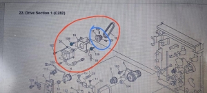 维修结果: 紧固对位驱动齿轮 总结: 该机对位机构由单独的对位电机驱动,电机输出轴上的皮带驱动齿轮由2颗内六角螺丝与电机轴固定。该齿轮松动后导致对位处供纸延迟并引发卡纸。 |