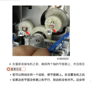 2:异响排除后,判断之前造成 J031 频繁卡纸的原因为齿轮磨损,因为打 齿,所以会有异响,并且因为打齿的时候二转会有抖动,80g 的双胶纸因为克 重要高一点,所以抖动的影响不是很大,所以能轻易通过,而 60-70g 的纸张 因为比较轻薄,此时因为抖动无法在正常时间内通过传感器,所以报错 J031 。 3:J031 的情况有很大好转,60-70g 的纸张也能正常打印了。但是每次打印 几百页之后还是会报错 J031,清除错误后,再打印几百页又会报错 J031。转 印时限传感的后面部分故障已排除,于是查找转印时限传感器的前面机械部分。转印时限传感器的前面部分为对位组件。如果纸张在此处有异物轻微阻 挡,使其纸张走慢了,也会造成卡纸。于是清洁纸路的输纸辊,走纸通道,顺 便查看对位门齿轮是否在原位上。 4:在检查对位门齿轮原位时,发现齿轮有不明显磨损痕迹(下图)