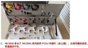 理光MC2000打印黑色测试页出现黑色竖线及无字区域,如图 解决方法: 更换黑色套鼓问题未解决,打印彩色样图未出现此类现象,考虑系鼓接触不良,打开前盖塞住门开关,用手顶住黑色硒鼓问题解决,最终发现系前一维修员未上黑色硒鼓固定螺丝,如图: