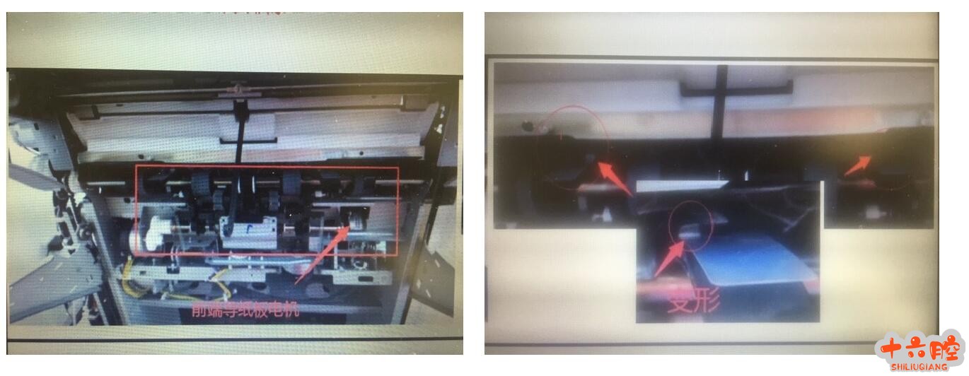 原因: 根据SC故障定义:装订在出现出纸处多次卡纸后显示SC720-82 。 前端导板电机错(第一次是卡纸通知,第二次是SC 通知)。 可能原因:接口电缆接头断开或损坏、控制器 PCB 不良、过载、电机不良、电磁铁不良、原位传感器不良。 现场实施措施: 1)检查装订器出纸和移动电机正常; 2)拆开后装钉器后盖和出口侧盖观察异响位置。 3)用SP6124-032测试前端导纸板电机,来观察异响部位。 4) 发现前端导板电机的导纸板上的附加聚酯导片变形。 5) 修正这两个导片后故障排除(见下图片)
