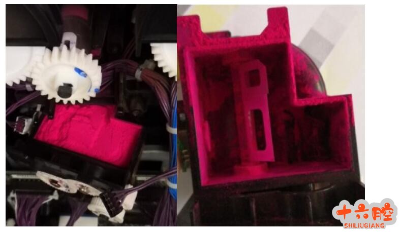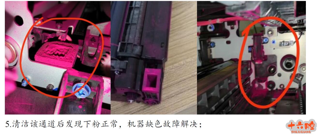 4. 再次检查品红色贮斗单元与品红显影仓之间连接通道,发现该通道堵塞;