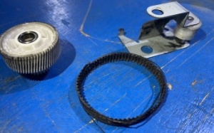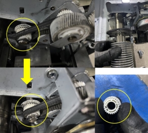 6.拆掉驱动皮带,发现皮带咬齿还可以,修剪后准备装上还能勉强使 用。待新皮带到货后再更换。