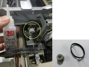 8.思索再三,决定先用502 胶水固定白色驱动轮,强行锁定其位置。 保证皮带不会因它而脱落,先保证客户的正常生产,后续待定件后 再行更换。