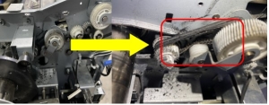 5.拿掉冷却带的驱动电机后,发现驱动皮带磨损并从张力轮上脱落, 致使冷却带转速不对,而产生卡纸的情况。