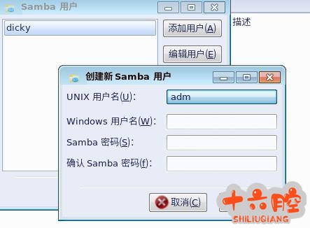 4. 弹出的对话框中选择“添加用户”—在弹出对话框中依次建立用户名和密码。 其中“UNIX 用户名”处最好选择“user”。如果找不到就选择当前登录用户的名字。