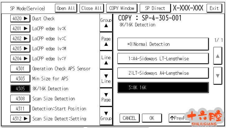 维修过程 1、如果使用8K/16K 纸型进行稿台复印时,需要将SP4305-001 修改为3,但是此时稿台复印A3/A4 纸型时将被检测为8K/16K 纸型,无法正常使用;