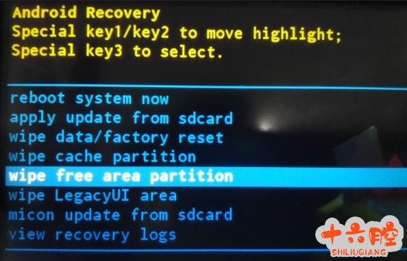 5. 显示蓝屏时,按住[EX1]和[EX2]键4 秒钟。 6. 进入恢复模式后 按[EX2]键4 下,将光标移到“Wipe free area partition”,,然后按[EX3]键执行空闲区域分区的擦除。