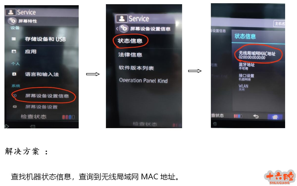 IMC2000/C2500/C3000/C3500/C4500/C6000根据客户需求,需要查询客户IMC3000机器上的无线局域网MAC地址原因:机器设置 维修过程:通过“Reset-806182-##C”进入SOP的智能面板模式后,按下图顺序操作(图中红圈)所示: