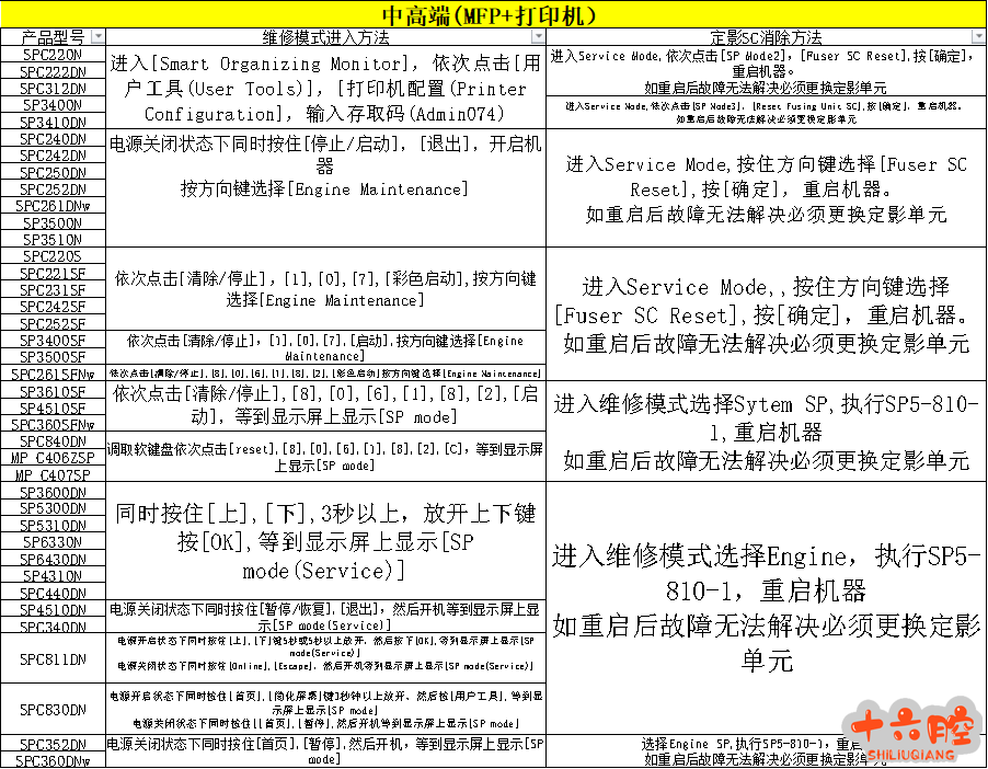 中高端打印机(维修模式调取方式+定影SC代码复位方式)SPC220N,C222DN,C312DN,3400N,3410DN,C240DN,C242DN,C250DN,C252DN,C261DNW,3500N,3510N,C220S,C221SF,C231SF,C242SF,C252SF,3400SF,3500SF,C261SFNW,3610SF,4510SF,C360SFNW,C840DN,MP C406ZSP,C407SP,3600DN,5300DN,5310DN,633SN,6430DN,4310N,C440DN,4510DN,C340DN,C811DN,C830DN,C352DN,C360DNW