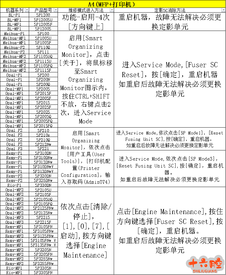 A4打印机(维修模式调取方式+定影SC代码复位方式)SP1200,SP1200SU,SP1200SF,SP1200S,SP100,SP100SU,SP100SF,SP1100,SP111,SP110SUQ,SP111SF,SP200,SP200N,SP200Q,SP200S,SP201SF.SP200SF,SP202SF,SP200SQ,SP200SFQ,SP201SFQ,SP210,SP210E,SP210Q,SP212NW,SP221,SP310DN,SP312,SP310,SP313,SP320dn,sp330,sp210su,sp210sf,sp212,sp221,sp310,sp312,sp313,sp320,sp325,sp330sn,sp330sfn