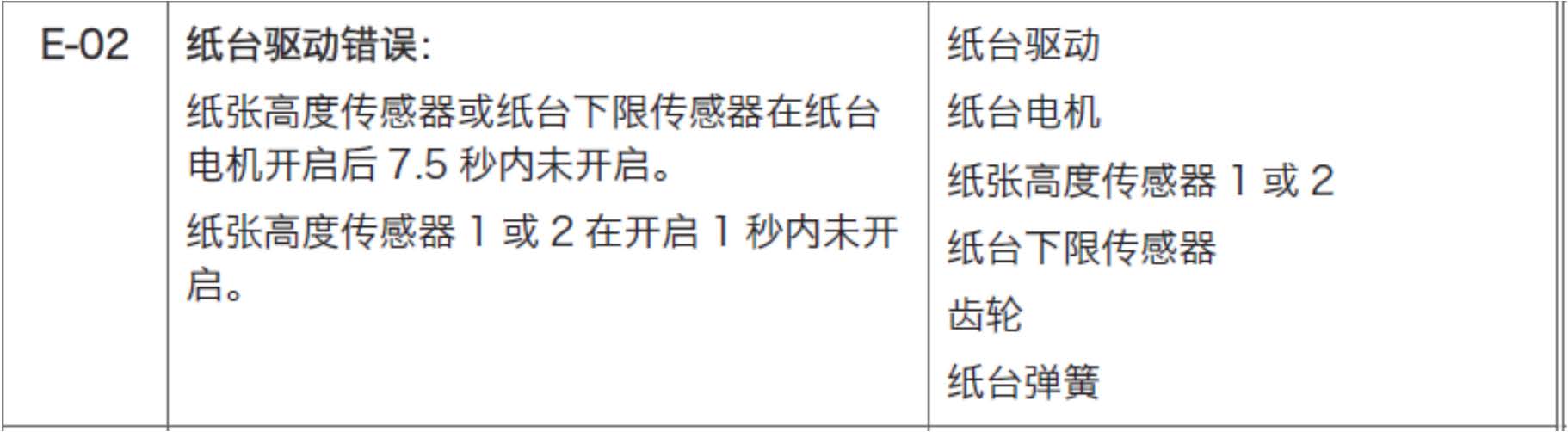 症状 故障:DD3344C 复印时纸盒抬升至3 分之一处经常性卡死,报E-02。 维修过程 1. 根据报错代码确认故障代码相关的硬件为:纸台电机,纸台驱动、纸台高度传感器、纸台下限传感器等硬件。