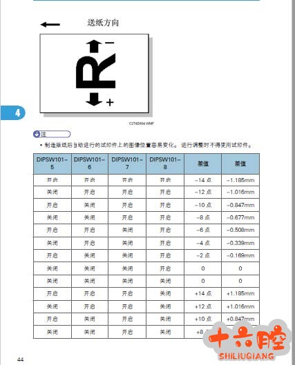 DD2433C一体机更换MPU板后,制版印刷印品图像主扫描方向边缘有黑线。 原因 版纸写入位置与原稿及印品图像不匹配。 维修过程 1. 检查时发现印品图像主扫描有偏移,造成图像边缘黑线。 2. 调整版纸写入位置后,故障解决。 解决方案 参考维修手册调整版纸写入位置,MPU板DIP开关SW101位5-8
