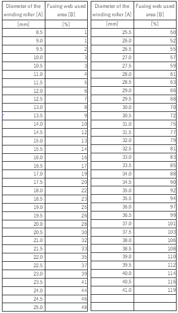 C.在下表[A]列中选择接近卷绕辊直径的值,并将相应[B]列的值输入SP1-902-001中; 重要事项: 如果要更换油网,但在安装油网后未使用机器,请在此 SP 中输入值“零”(根据维修手册第 4 节中的油网单元重新组装过程)。例如:如果卷绕辊的直径为 13.4 mm:· 从列 [A] 中选择“13.5”。· 这对应于列 [B] 中的“9”。在 SP1-902-001 中输入值“9”。