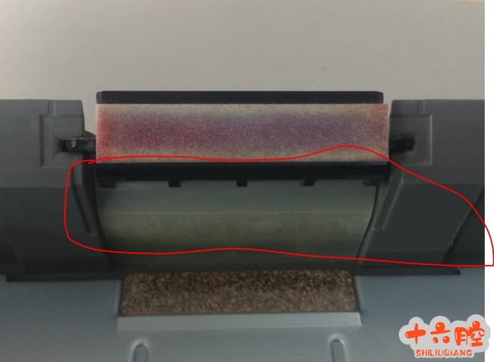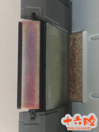 可能的原因: PCDU 不良,激光单元不良,主电机不良,供纸不良; 维修过程 1. 依据图像变形来看,判断可能为鼓转动出现停顿引起图像压缩,检查PCDU 转动无异常,更换PCDU 单元无效; 2. 更换激光单元,无效; 3.检测主电机转动情况,无异常,更换主电机,无效; 4.检查对位辊动作情况,无异常; 5.检查纸盒单元,发现该机纸盒的摩擦垫聚酯片有凹陷,如图所示: