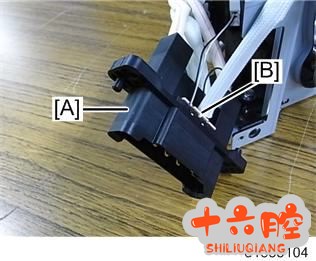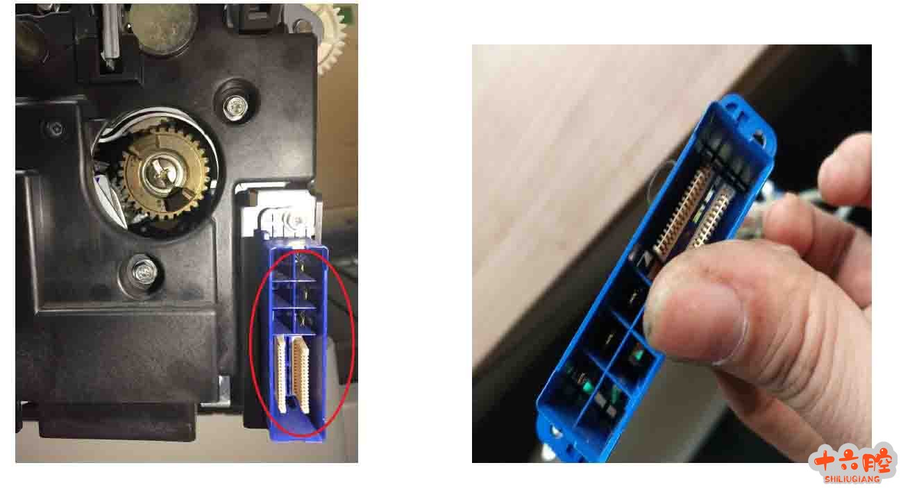 维修过程 检查连锁开关等设置,抽屉接头均正常。 检查定影单元右侧的大插头位置有残留纸张,取出后推回大抽屉,机器依然显示定影安装错误。拆解定影单元检查定影大插头,发现插头内的插芯变形现象,现场调整插芯恢复后,机器显示正常。(详见下图红圈标识)