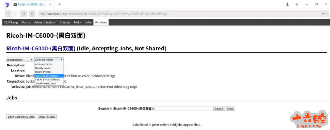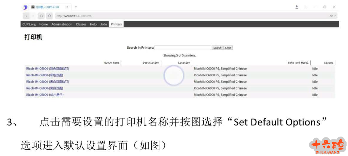 步骤二:设置打印机默认设置1 、打开浏览器输入: localhost:631 2 、选择" printers " 进入打印机列表(如图:)