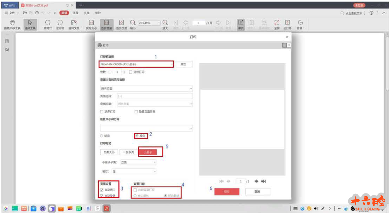 二、PDF 打印设置(PDF 有很多软件可以使用,此教程只针对WPS PDF,由于WPS PDF 软件有少数BUG, 请按图编号步骤设置, 如图:)
