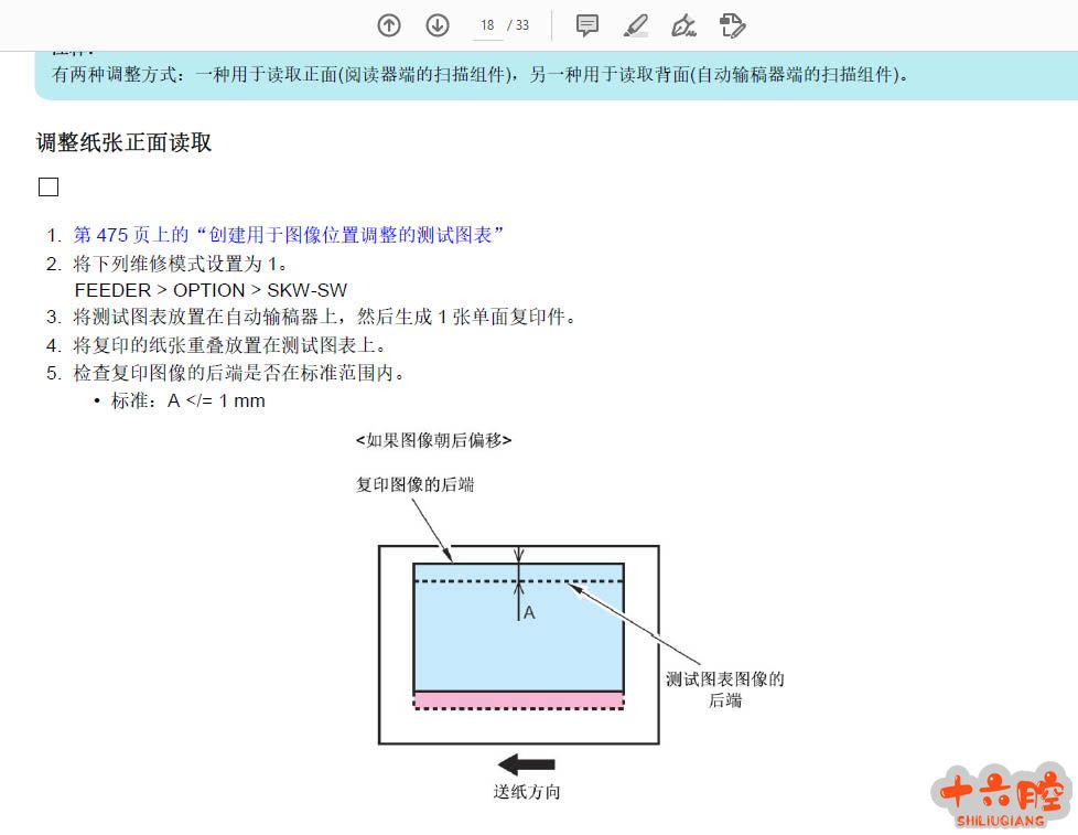佳能单程DADF-C1_ 进稿器中文维修手册+调整方法手册 倾斜调整(通过流读取方式进行原稿扫描时) 如果通过流读取方式扫描的图像在完成打印机端的调整后倾斜,根据如下工作流程执行倾斜调整。 注意: