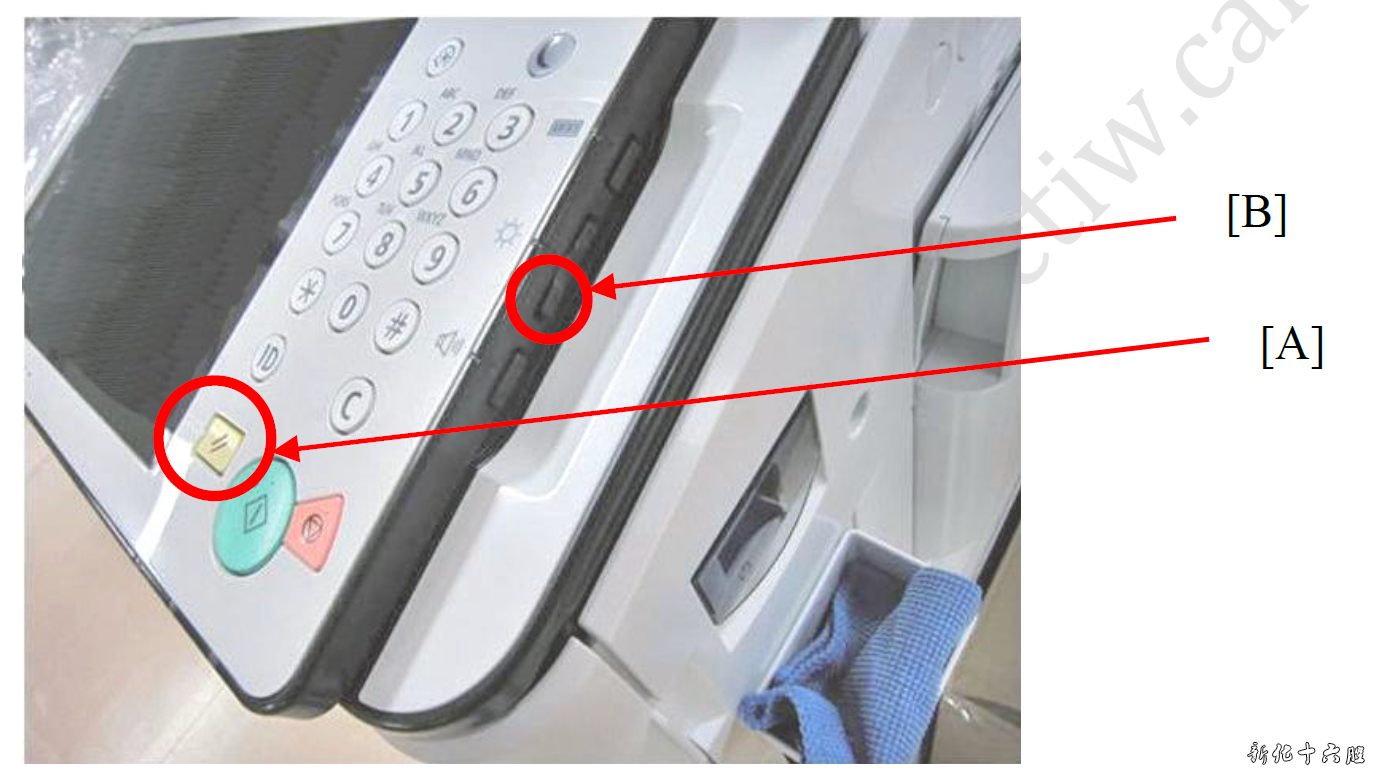 iR-ADV 65500 系列 iR-ADV C5500 系列 iR-ADV C7500 系列 故障现象 - 触摸屏反应不灵敏时 - 更换触摸屏操作面板时 - 更换控制面板CPU 板时 故障原因 电磁干扰引起的操作面板灵敏度降低,或更换操作面板零件后的操作。 现场对策 现场执行触摸屏消磁操作。 操作步骤: 1. 关闭主机电源 2. 按住控制面板上的复位按钮[A]和LCD 亮度减小按钮[B]的同时,打开主电源开关并保持按住[A]和[B]按钮。