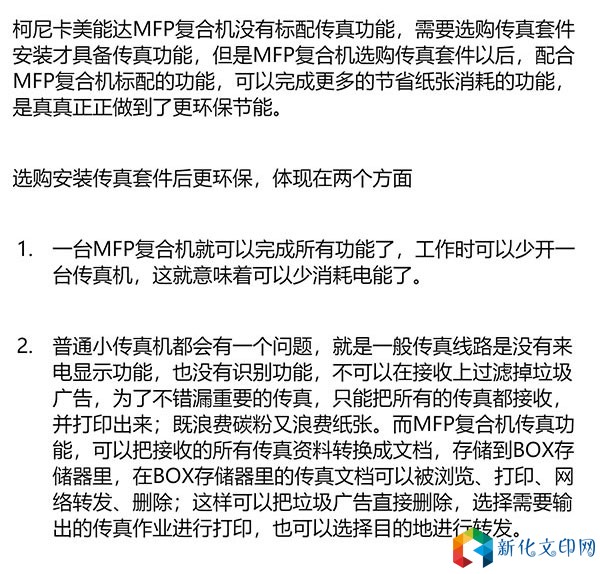 柯美MFP复印机没有标配传真功能,需要选购传真套件安装才具备传真功能,但是MFP复印机选购传真套件以后,配合MFP复印机标配的功能,可以完成更多的节省纸张消耗功能,是真真正正做到了更环保节能。