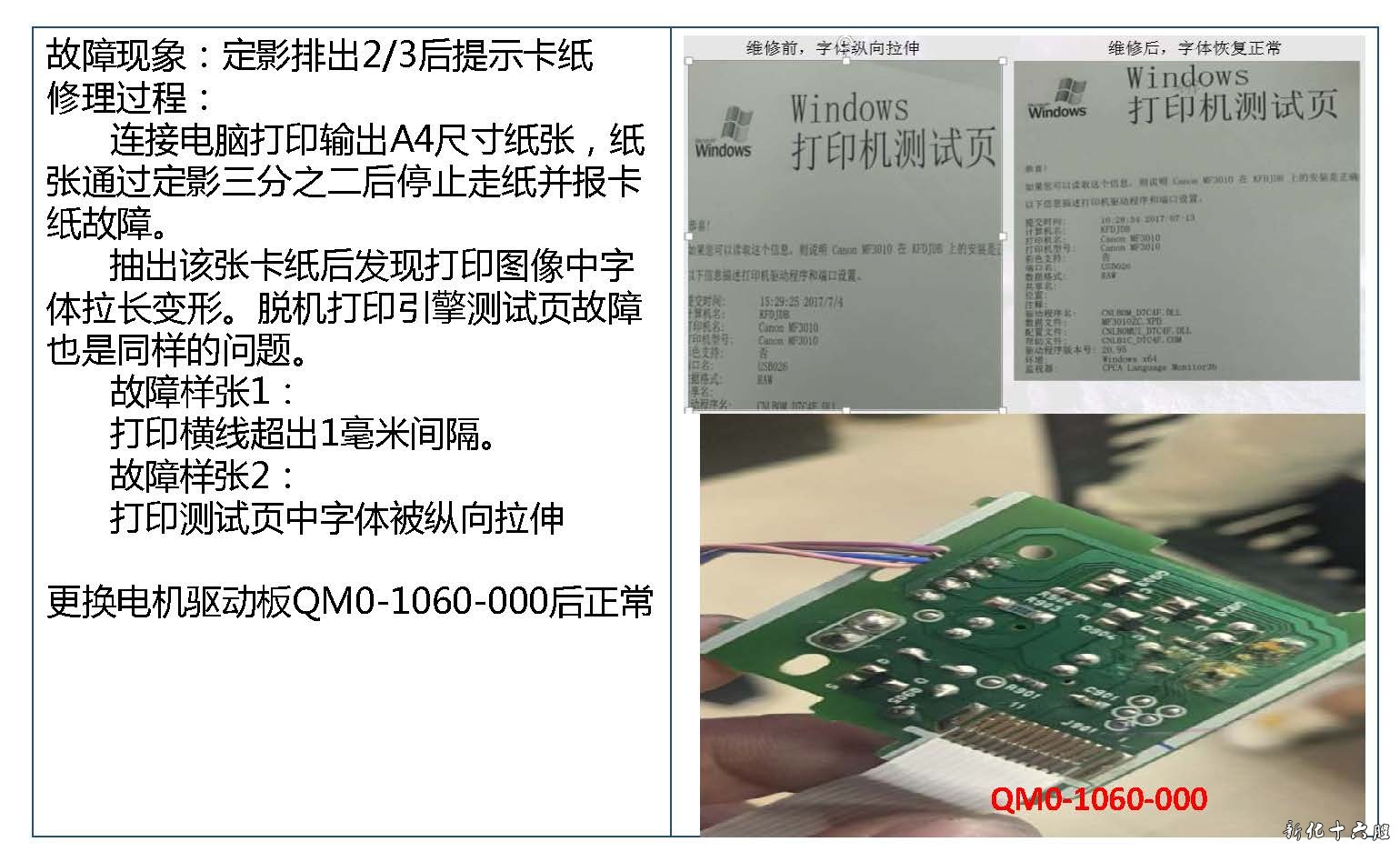 本帖最后由 艺东 于 2018-12-14 09:18 编辑 故障现象:定影排出2/3后提示卡纸 修理过程: 连接电脑打印输出A4尺寸纸张,纸张通过定影三分之二后停止走纸并报卡纸故障。 抽出该张卡纸后发现打印图像中字体拉长变形。脱机打印引擎测试页故障也是同样的问题。 故障样张1: 打印横线超出1毫米间隔。 故障样张2: 打印测试页中字体被纵向拉伸 更换电机驱动板QM0-1060-000后正常