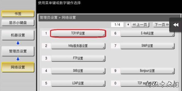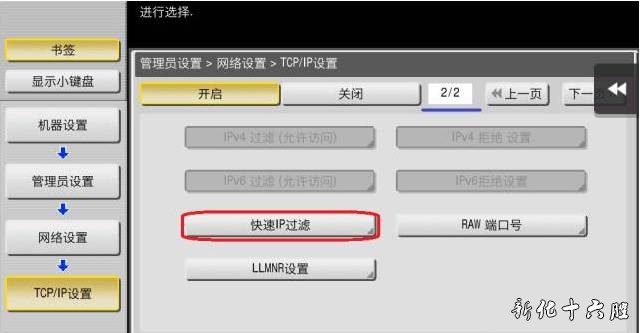 2,选择“TCP/IP设置” 柯美复印机网络打印无响应 3,翻到第2页,选择“快速IP过滤” 柯美复印机网络打印无响应