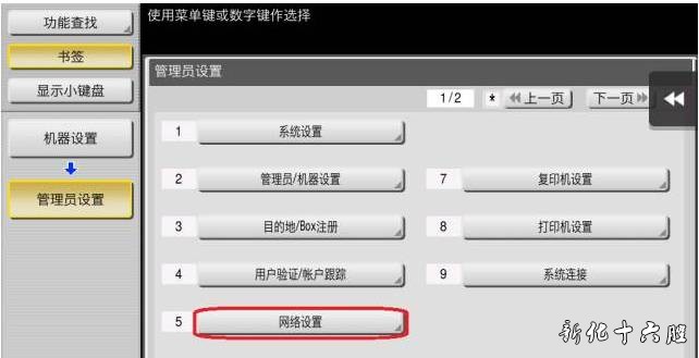 1,进入管理员管理,选择“网络设置” 柯美复印机网络打印无响应