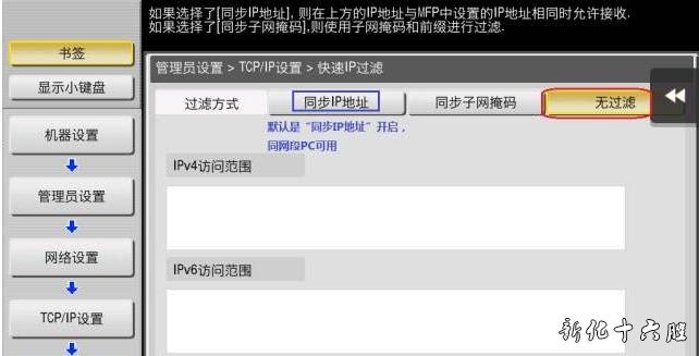 4,选择“无过滤”按OK键即可(默认是“同步IP地址”) 柯美复印机网络打印无响应 设置完成即可。