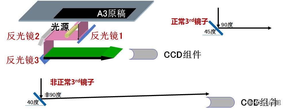 今天给大家分享扫描灯架反光镜歪斜如何调整。 <判断步骤> 1.新装机故障,考虑更换CCD和MFPB测试,故障未变化,未解决问题。 2.随后调整CCD平台螺丝高度至7mm灰黑区域变小,有变化,最终稿台正常,但是输稿器全黑。 3.判断和灯架移动过程中光路倾斜有关,灯架移动后半部无光线进入CCD。