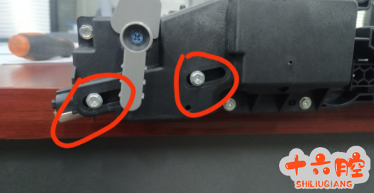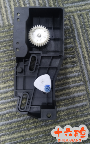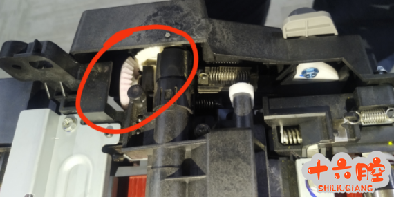 理光彩机C2011印量大约七八万,客户反应有异响,现场看未发生,后出纸时有黑色转印带碎片带出,现场确认转印带破损,未发现其他异常,更换转印带后大约一个多月,再次发生转印带破损现象,现场再次确认四个套鼓,定影,转印无异常,在确认转印带组件架子时发现转印带前侧左侧废粉把手如图二掰下来正常工作状态时,图二两个红圈螺丝的位置不在最左端,后确认为图一白色凸轮D切面断裂,这就意味把手组件内侧图三处两个白色齿轮无法咬合到位,而有一个白色齿轮就是转印带废粉驱动齿轮,咬合不到位转印带上的废粉就无法回收到废粉盒,转印带上废粉堆积产生响声,进而影响皮带走偏导致皮带破损,更换此凸轮及废粉回收组件后正常使用。