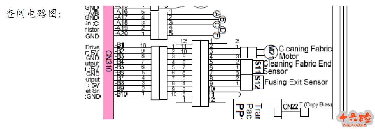 理光Pro1107ex、Pro1357ex、907、906、1106、1350定影清洁纸电机不转 症状 复印品上有散落的粉点,检查定影清洁纸,发现清洁纸不卷收,使用SP5804-34 输出测试清洁纸电机,发现清洁纸电机不转,更换清洁纸电机,更换清洁纸用完传感器,更换IO板(主板),故障依旧。 查阅电路图: