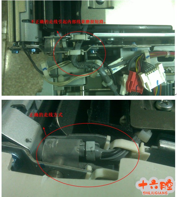 用万用表测量BI,B2 端点无5v 电压输出,由于IOB 板更换无效,复印机其他功能正常,分析可能原因应是IOB 板5V 的输出有短路地方。仔细检查IOB 板周围输出,发现双面器输出断开后,清洁纸电机正常。 原因 双面器上换面活门连接线走线方法不正确,经常开关活门上盖板时,容易拉抻线束,引起线束绝缘层磨损,从而短路。
