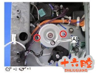 诊断过程 1) 检查压辊原位传感器并重新连接插头,故障依旧。 2) 使用输入检查SP5-803-047 测试压辊原位传感器,传感器正常。 3) 检查压辊编码器,未见异常。 4) 更换定影单元,故障依旧。 5) 检查并重装出纸/压力释放电机插头,故障依旧。 6) 使用输出检查SP5-804-037 测试出纸/压力释放电机,电机无负载时正常,有负载时会出现转不动或不转现象。 7) 更换出纸/压力释放电机后,机器正常。零部件见下图【A】: