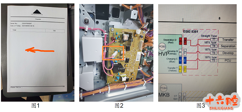 症状 MP3055SP机型安装后打印计数器页时满幅面有轻微底灰。 维修过程 1、仔细观察样图发现除了先端删边区域以外的其他区域均存在轻微底灰(先端较为明显),此类故障比较符合电器接触方面的原因引起。 2、工程师现场更换PCDU 单元故障依旧,故障机的PCDU 单元在其他机器上测试图像良好,据此已排除图像单元问题 3、检查PCDU 单元与机器的接触点(充电、显影偏压),均接触良好未见异常。 4、检查纸张转印辊电压接触点,未见异常;更换转印辊组件,故障依旧。 [kkpay=4]5、考虑更换高压板测试,打开后盖发现高压板T2 高压端子未连接(图2),重新连接后故障排除。查询点对点图确认T2 端子为显影偏压端子(图3)