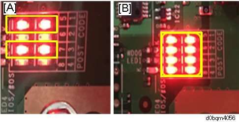 Fig. 3: 错误状态[A]: LEDs 1, 3, 5,和7 点亮[B]: LEDs 1 到 8 全部点亮