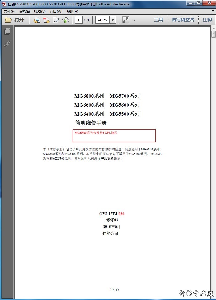 本《维修手册》包含了单元更换方面的维修维护的信息,信息适用于MG6800系列、MG6600系列和MG6400系列。本手册中的某些信息不适用于MG5700系列、MG5600系列和MG5500系列,应对这些系列进行产品更换维护。 不能进纸。 检查重点&解决办法 (1)送纸器未插到底。 -> 将其插到底。 (2)后导板单元错位。 -> 正确安装单元。 (3)走纸路径中有外来物 -> 清除外来物。 (4)搓纸辊单元有污迹。 -> 清洁搓纸辊或更换单元。 以一定角度进纸。 (1)送纸器的导纸板调节不当。 -> 将其与纸张边缘完全对准。 (2)搓纸辊单元有污迹。 -> 清洁搓纸辊或更换单元。 (3)走纸路径中有外来物 -> 清除外来物。 能进纸,但不正确(多张进纸) (1)送纸器中放置了超过规定的纸张数量。 -> 将纸张数量降到低于限定值。 (2)搓纸辊单元有污迹。 -> 清洁搓纸辊或更换单元。 (3)纸盒单元中的分纸垫有污迹。 -> 清洁分纸垫。 弹出空白纸 (1)搓纸辊单元有污迹。 -> 清洁搓纸辊。 (2)PE传感器导线未正确连接。 -> 清洁搓纸辊或更换单元。 (3)搓纸辊单元折断或变形。 -> 更换单元。 (4)PE杠杆的弹簧折断或变形。 光电开关未正常检测。 ->更换内导杆单元。 打印纸上有齿痕 (1)齿轮单元中有外来物(比如头发) -> 清除外来物。 如果问题仍然出现,更换以下部分: - 齿轮单元 打印机不能被连接的PC机识别,或出现一个(1)USB导线未正确连接。 通信错误。 PC打印中途停止。 -> 正确进行连接。 (2)无线LAN导线损坏。 -> 更换单元。 如果问题仍然出现,更换以下部分: - 无线LAN板组件 (对于MG6600系列,由于此系列没有NFC信息写入工具,故不能互换。 如有必要,更换打印机)。 链接:https://pan.baidu.com/s/1rMlWNIaZfjRT0iNQUujNfQ 提取码:zhcg 复制这段内容后打开百度网盘手机App,操作更方便哦 |