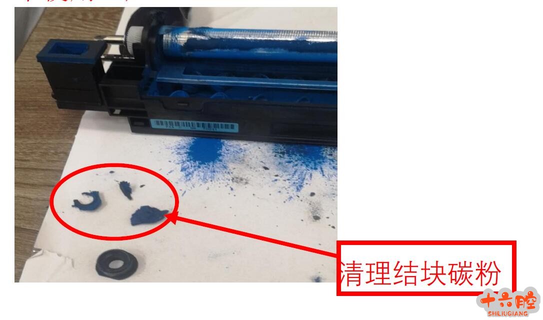 异响故障: 1)机器回收废粉仓。 维修过程 现场维修措施: 1)拆装机器查检相关连接线束,线接头和重装IOB板。重装PCDU。启动机器检测故障无法排除。 2)更换机器显影电机,IOB板和机器回收废粉仓,故障依旧存在。 3)更换机器的青色PCDU单元,故障排除。 (注:折开PCDU单元,清除显影仓内载体检查显影仓盘管,发现显影剂供应盘管往后端已经有结块现象。拆开盘管轴套清理结块后机器正常使用。)