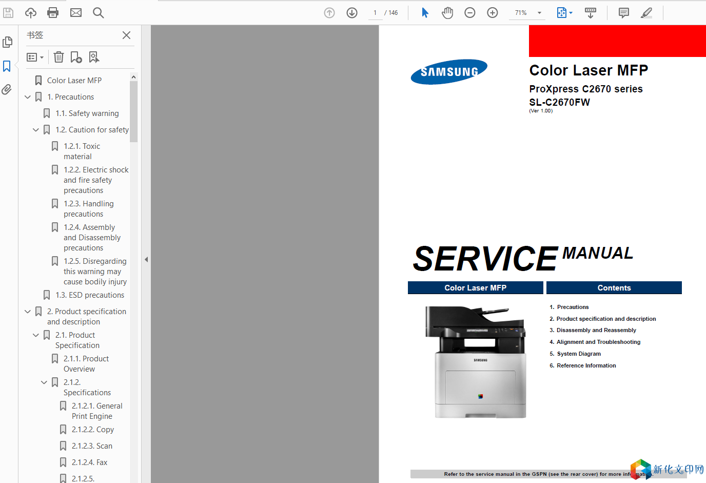三星激光数码复合机C2670维修手册故障诊断机器拆装图解资料 本手册适用于以下机型 Color Laser MFPProXpress C2670 seriesSL-C2670FW 手册格式:pdf手册语言:英文手册页数:146文档大小:15M
