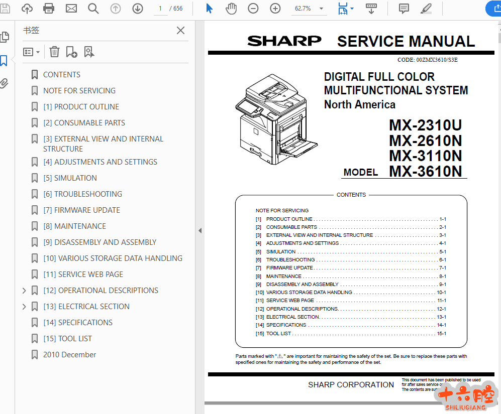 夏普 MX-2310U 2610N 3110N 3610N 彩色复印机英文维修手册 语言:英文 页数:656页格式:PDF电子版,无加密