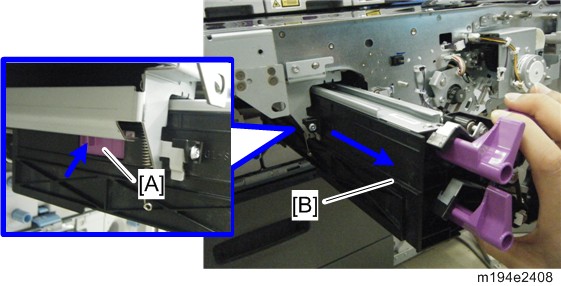 - 按触释放杆[A]并拉出ITB清洁单元[B]。