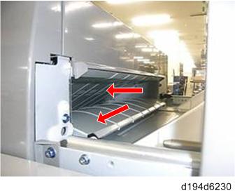 清洁桥接单元- 打开中继单元的前舱门,然后打开并清洁导板[A].