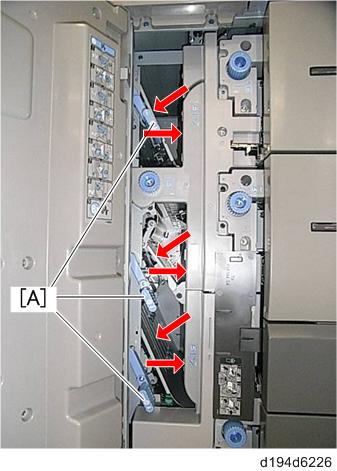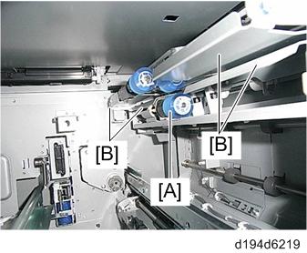从进纸盘清洁转印导板。一般这样操作后可以解决问题。备注- 下图所示,主机的纸张转印纸路(纸盘1和2), RT5090 (纸盘3到5),和手送纸盘到转印辊[A].