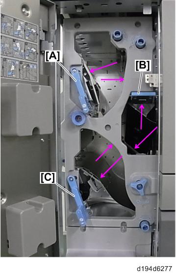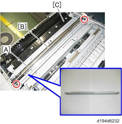 - 清洁纸盘[A], 转印时序辊[B], 和进纸导板[C].