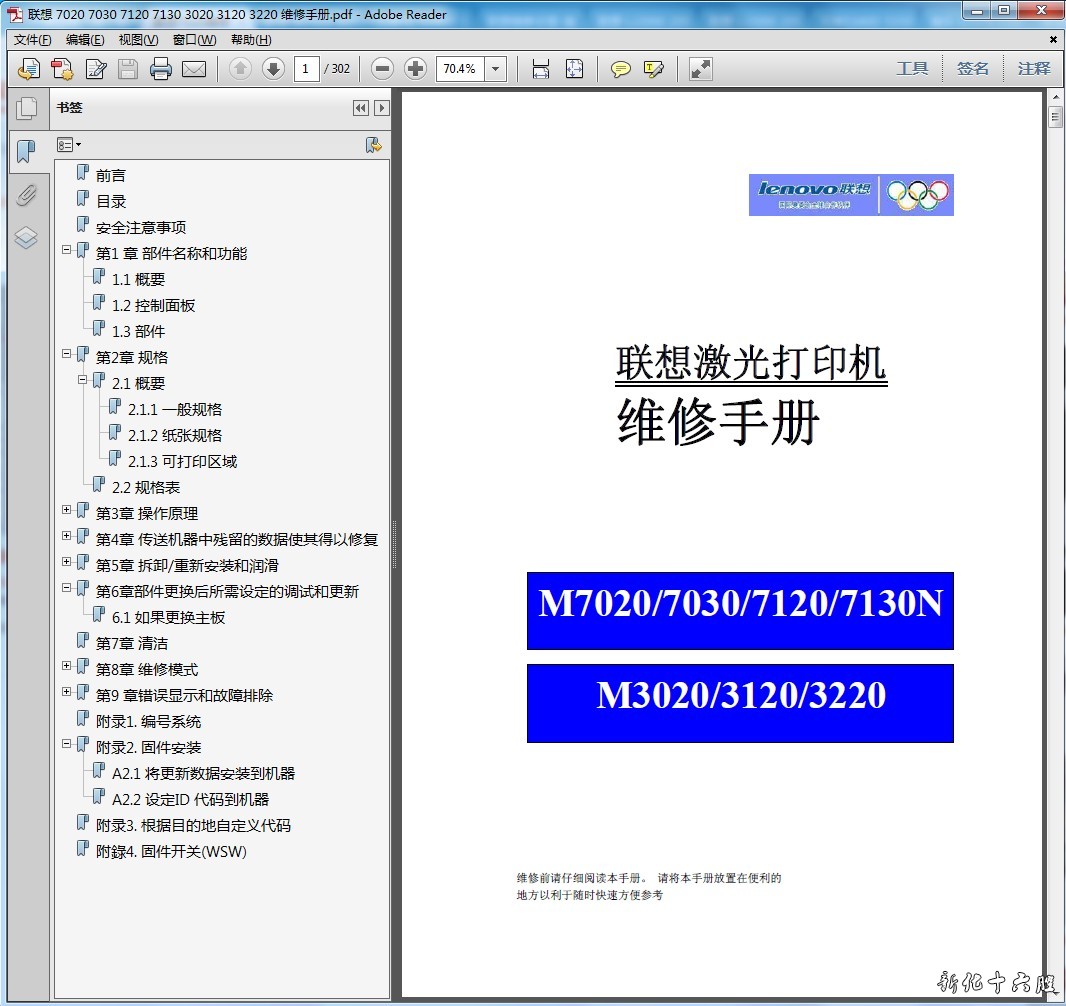 前言 第1 章 部件名称和功能 包括外观和部件的名称及部件的功能。同时还提供了控制面板上的各个按键的信息从而有助于维修人员对机器进行正确检查和调整运作。 第2 章 规格 列出各型号的规格,有助于维修人员对不同的机型做出比较。 第3 章 操作原理 总括了扫描和打印装置以及传感器、调节器和电子装置功能等。有助于维修人员对机器的基础工作原理有一定了解同时找出故障并予以排除。 第4 章 传送机器中残留的数据使其得以修复 描述了如何传送机器中残留的数据使其得以修复。当因打印装置发生故障而导致用户不能打印接收数据时, 维修人员须指导用户按本章中所描述的传送步骤将接收到的数据传送到另一个机器以防数据的丢失。 第五章 拆卸/重新安装和润滑 详细展示了机器拆卸和重新安装的步骤以及相关的注意点。为维修人员提供了一目了然的流程图以便以最快方式拆卸相关部件。 只需在拆卸开始之前,在流程图上查看一下需要拆卸的部件,就能以最快的方式将部件拆下。 本章还附有各螺丝的紧固扭矩和各重新安装时需加入润滑剂的润滑点。 第6 章 零件更换后所需设定的调整和更新 详细说明了更换打印头/滑动架单元,主板和其他部件更换后对设置的调整和更新。 链接:https://pan.baidu.com/s/16pjrQg3vuWAcGifnJ4fLTg 提取码:80vi |