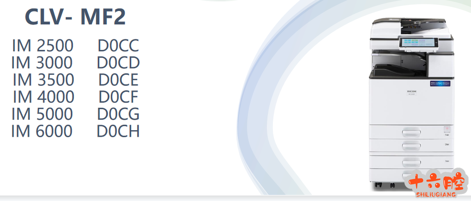 理光IM 2500,3000,3500,4000,5000,6000中文培训资料手册 型号及速度: Clv - MF2c - IM 2500 : 25 (A4)/25(LT)ppm Clv - MF2d - IM 3000 : 30 (A4)/30(LT)ppm Clv - MF2e - IM 3500 : 35 (A4)/35(LT)ppm Clv - MF2f - IM 4000 : 40 (A4)/40(LT)ppm Clv - MF2g - IM 5000 : 50 (A4)/50(LT)ppm Clv - MF2h - IM 6000 : 60 (A4)/60(LT)ppm 新特性: 智能操作面板 “Cheetah-G2.5” 新的SOP 特性,例如全屏、改进的点击灵敏度、重新设计的主屏幕和内置的NFC SPDF 的新选购件 纸张固定单元(双面进纸检测单元) 小纸张进纸盘(选购件) 兼容ACT