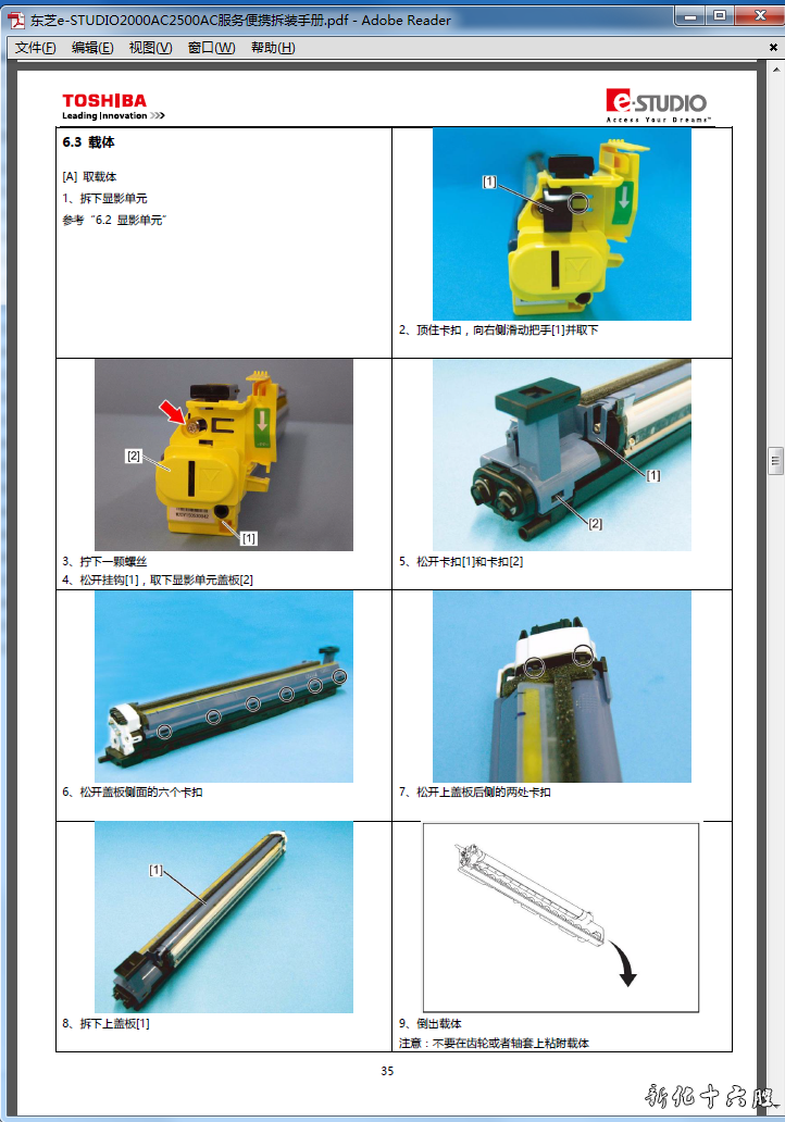 东芝 e-STUDIO 2000AC 2500AC 中文拆卸 拆机 安装维修手册 资料 语 言:中文格 式:PDF电子版,无加密页 数:87页手册内容详实,图文并茂,是维修人员的好帮手,有了维修手册,这款机子的拆卸、故障排除您就不用再发愁了!即使是普通的用户,也可以根据维修手册解决简单的故障。