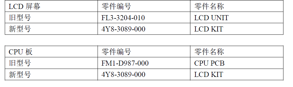 【故障原因】: 由于机器的系统固件和新型号的(FM1-F286)的操作面板在特定情况下不兼容造成的。 【故障原因】: 出现问题后,现场更换操作面板并且升级M-CON到v83.01及以上版本。 【维修零件】: 目前现场出现上述故障后,可更换下述三种零件: 零件名称 零件编号 LCD UNIT KIT 4Y8-3089-000 CONTROL PANEL ASSEMBLY A FM3-9355-000 CONTROL PANEL ASSEMBLY B FM1-F286-000 注意: 1、根据SPC 提供的信息,TYPE A 型号面板FM3-9355-0000 已经变更为FM3-9355-010. FM3-9355-010 和FM1-F286-000 除面板上面有英文字母的区别外,其余零件均相同。 2、LCD UNIT KIT 零件包含‘LCD UNIT’和‘CPU PCB’两个零件,如果现场新型号的操作面板出现故障时,如果不想更换整个操作面板组件,只想更换LCD UNIT 时,务必订购LCD UNIT KIT(4Y8-3089),如果订购了零件手册中的LCD UNIT(FL3-3204-010)或者FM1-D987(CPU PCB)会出现不兼容的问题,对应关系如下所示: