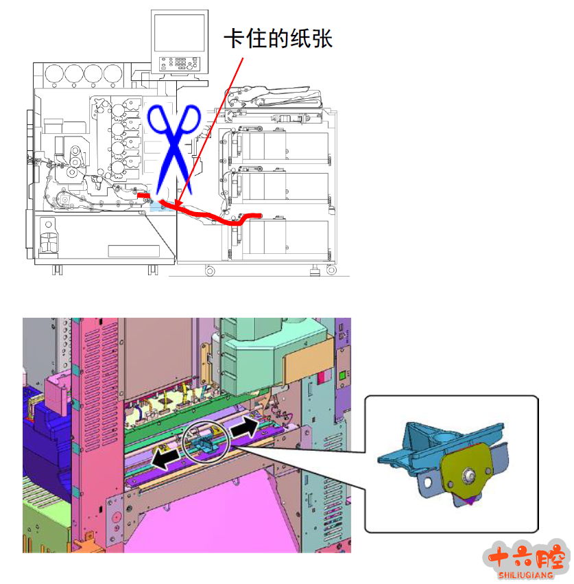 此机制在1.0版的主机中已实施,但未使用。(因为当时不支持横幅纸。) 横幅纸切刀被锁定螺钉锁住。(在2.0版及更高版本中,该锁定螺钉已于安装时拆下。) 用途: 裁切卡住的横幅纸 控制: 横幅纸发生卡纸时,卡住的纸张会跨越主机与PFU。因此无法拉出ADU。用户可移动横幅纸切刀,裁切卡住的纸张