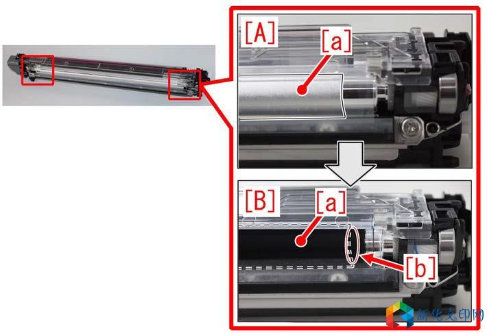 [故障原因] 该故障是由于载体在涂层区域[a]外积聚后产生雾化造成的。特别是当载体在涂层区域的边缘处积聚过多时,可能会导致在图像的相应位置上出现深色雾状脏污。 图[A]显示的是未使用的显影组件,图[B]显示的是产生雾化情况的显影组件。