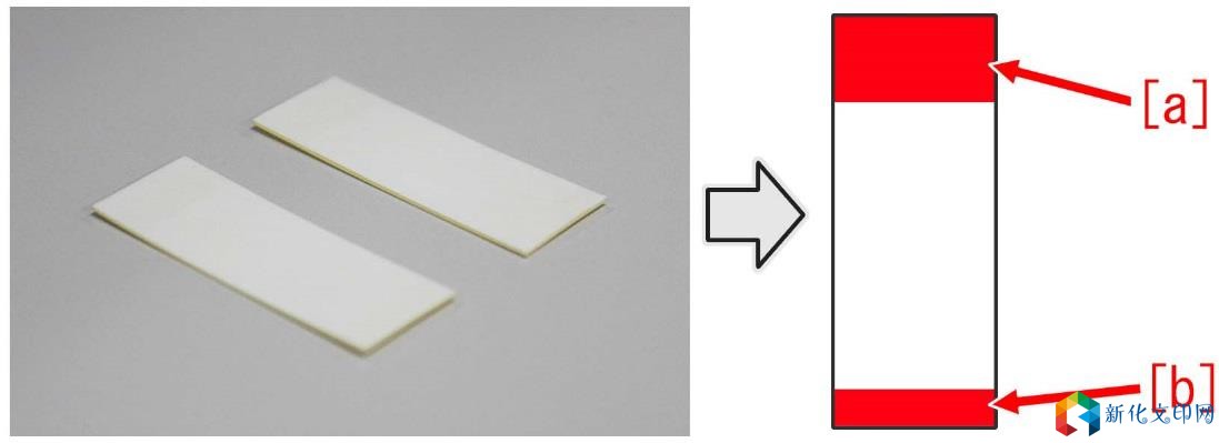 [维修措施] 当出现上述故障时,需要准备新设定为专用维修零件的侧端密封条(FL1-7769-000),按照如下的操作步骤在每支显影组件上安装2 片侧端密封条。 [说明]如下图所示,从侧端密封条背面拆下背衬纸时,可看到较大的粘接面积[a]和较小的粘接面积。